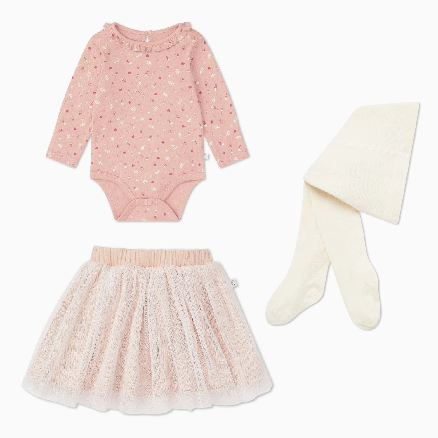 Our floral bodysuit, tutu & tights outfit is made for little ones who love to twirl and play. The set includes a comfortable bodysuit with poppers for quick dressing. It comes with a fun & twirly tutu skirt and cozy tights to keep little toes toasty.
