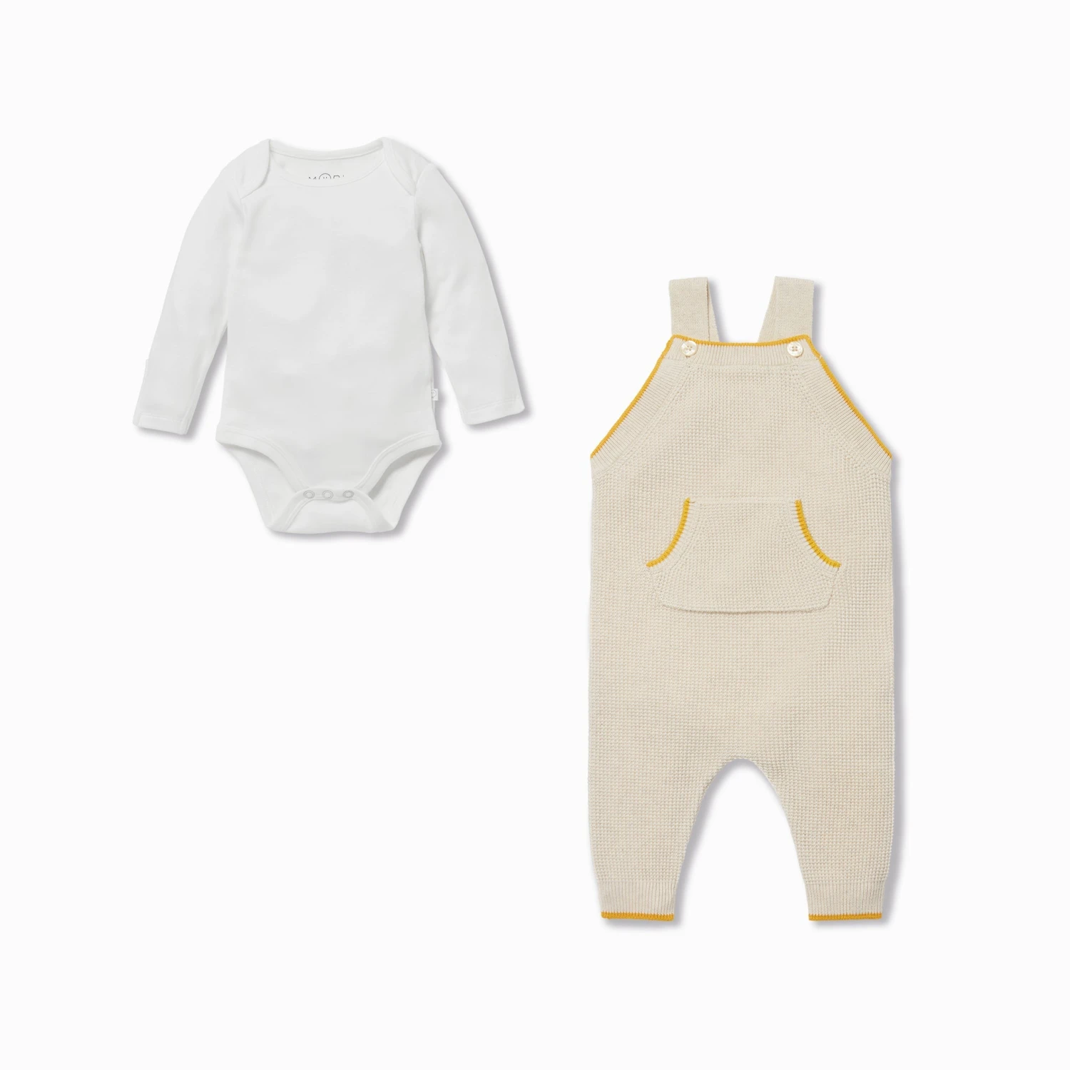 Our Knitted Pocket Overalls & Bodysuit Outfit is the ultimate one-and-done winter set. The organic cotton overalls have a soft waffle stitch and adjustable straps. The bodysuit is crafted in our softest ever signature fabric.