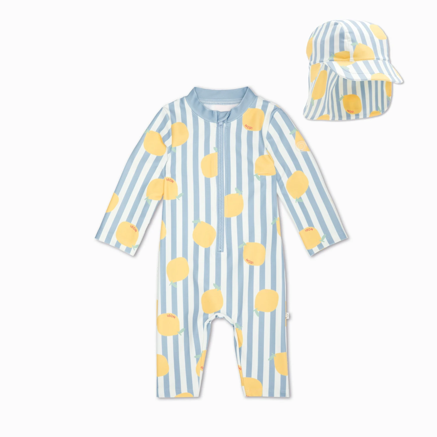Trips to the pool have never been cuter! Our lemon-printed one-piece rashguard has long sleeves to protect your little one from the sun and a zipper for easy changes. It comes with a peaked hat. Both are made from UPF 50+ rated fabric for sun safety.