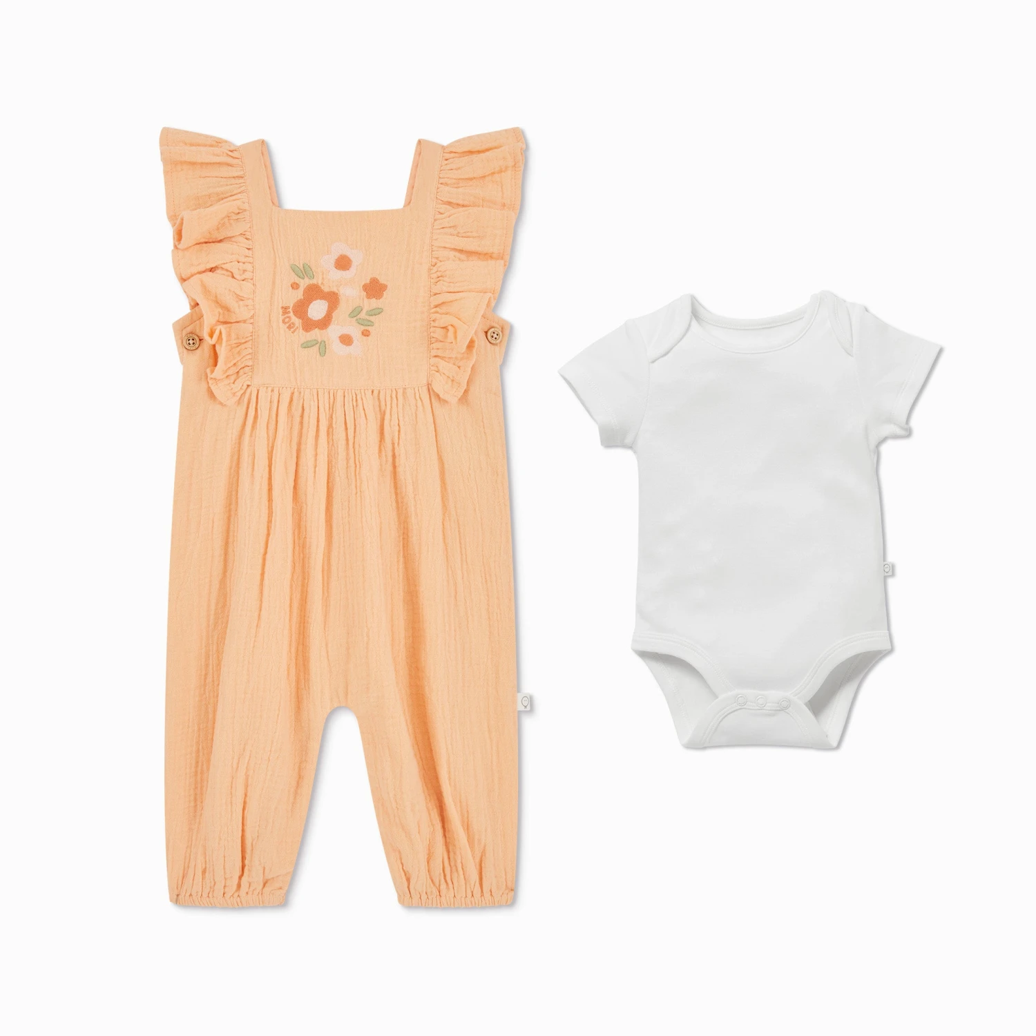 Make summer dressing a breeze with this ready-to-go outfit. The overalls are crafted from lightweight organic cotton muslin and feature pretty embroidered flowers on the chest. They come with a signature fabric bodysuit, which is temperature-regulating to keep little ones cool.