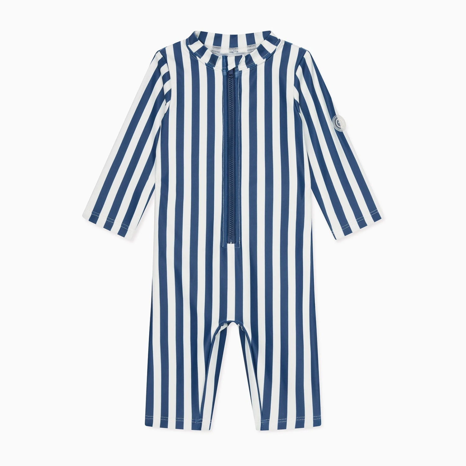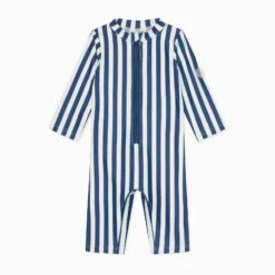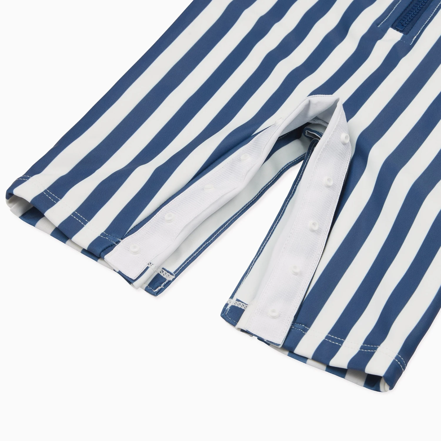 Our striped one-piece rashguard is perfect splashing at the beach or pool. It’s made from UPF 50+ rated recycled nylon with a little stretch for comfort. The rashguard has a handy zipper down the front and poppers for quick changes.