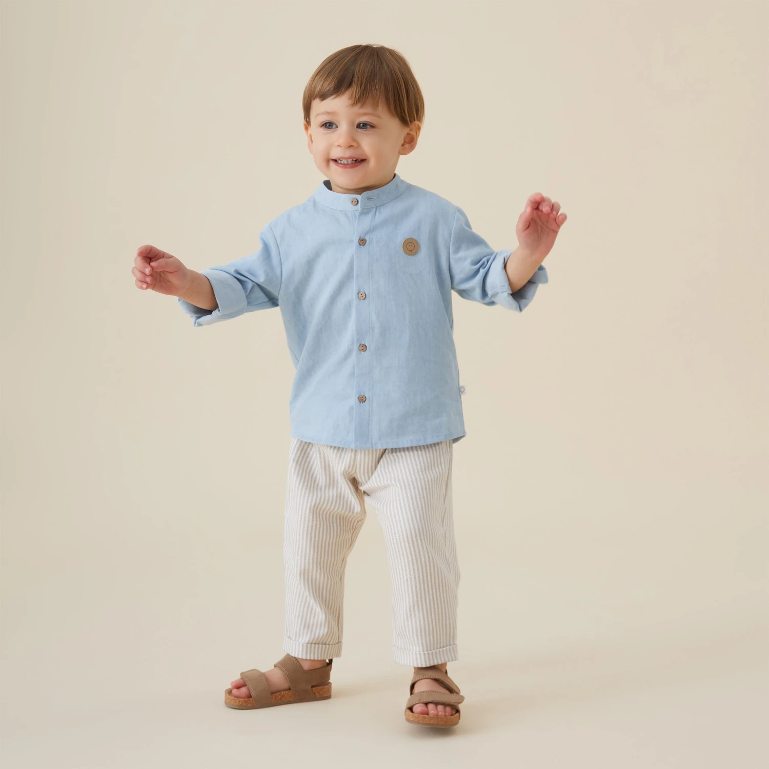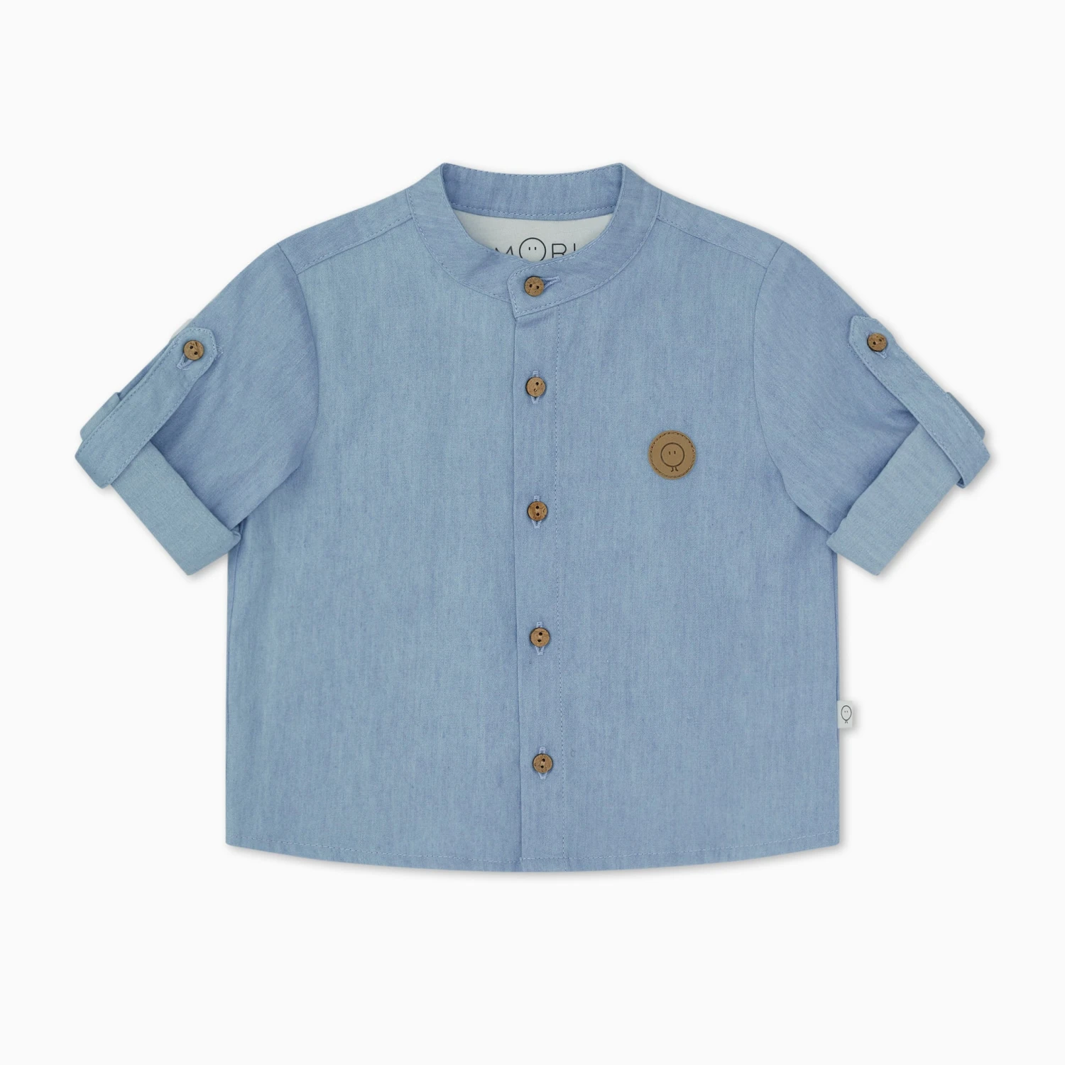 In breathable organic cotton, our Chambray Long Sleeve Shirt will keep your little one cool in warmer weather. It features buttons down the front and a mandarin collar. The sleeves can be fastened back.