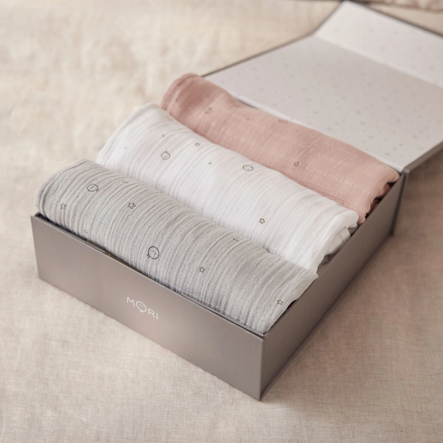 Our Pre-Washed Regular Muslin & Burp Cloth 3 Pack ensures parents will be ready for any moment, from mopping up spillages to discreet breastfeeding. They are crafted in soft and breathable cotton for comfort on your little one’s skin. Each muslin features a MORI print in one corner.