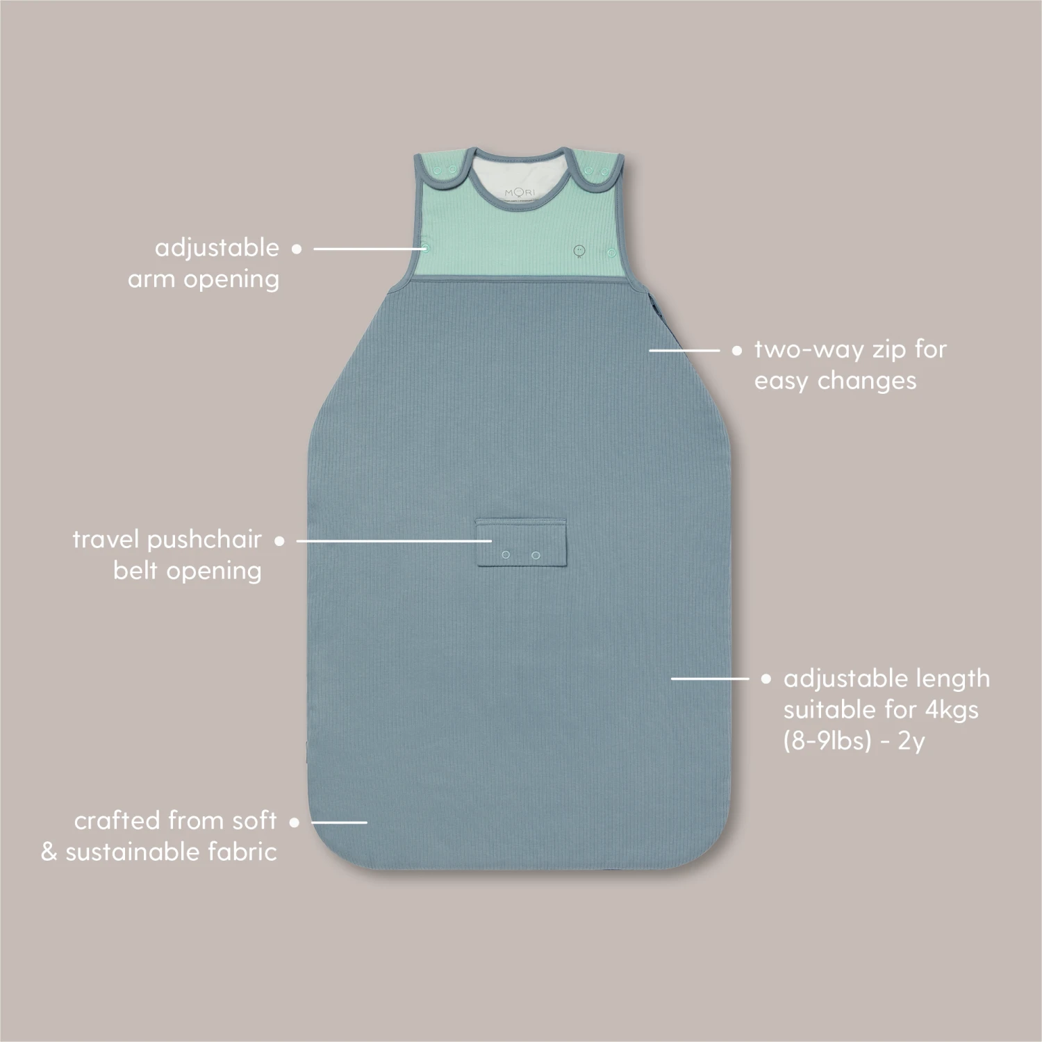 The Ribbed Clever Sleep Sack 1.5 TOG is the weight for all year round. It’s crafted in our stretchy organic cotton and bamboo from viscose fabric which is breathable and thermoregulating to help keep your baby or toddler at the perfect temperature all night. The fitted neck and armholes ensure there is no danger of slipping, whilst maintaining the freedom to move. It also features a double-direction zipper to make nighttime changes a little bit easier.