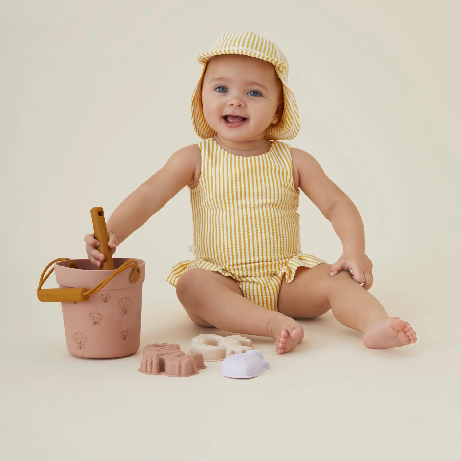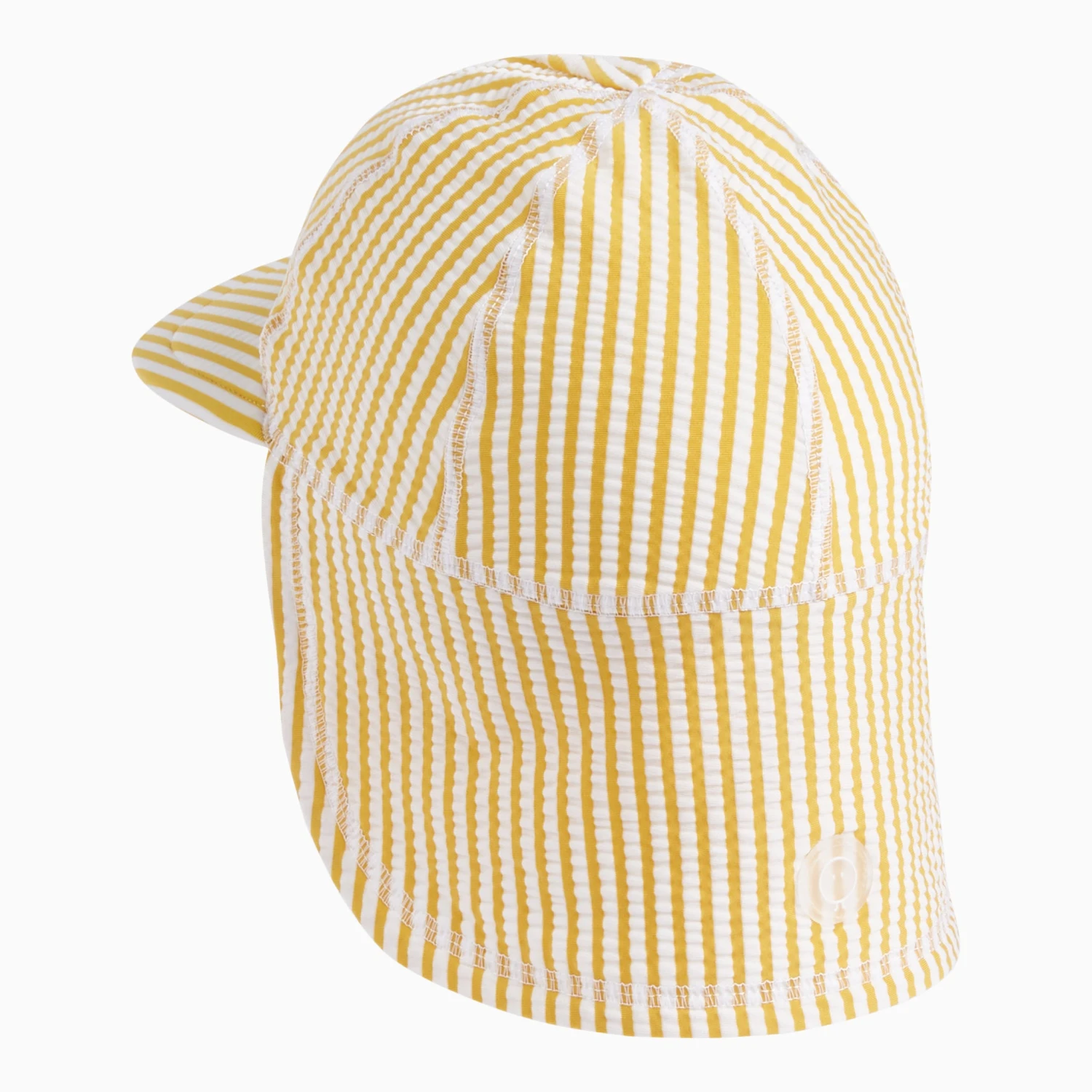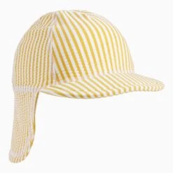 A fixed peak and neck cover makes our Seersucker Mustard Stripe Sun Safe Swim Hat perfect for sunny days by the water. It’s made from recycled nylon with stretch for comfort. The fabric has a UPF 50+ rating for sun safety.